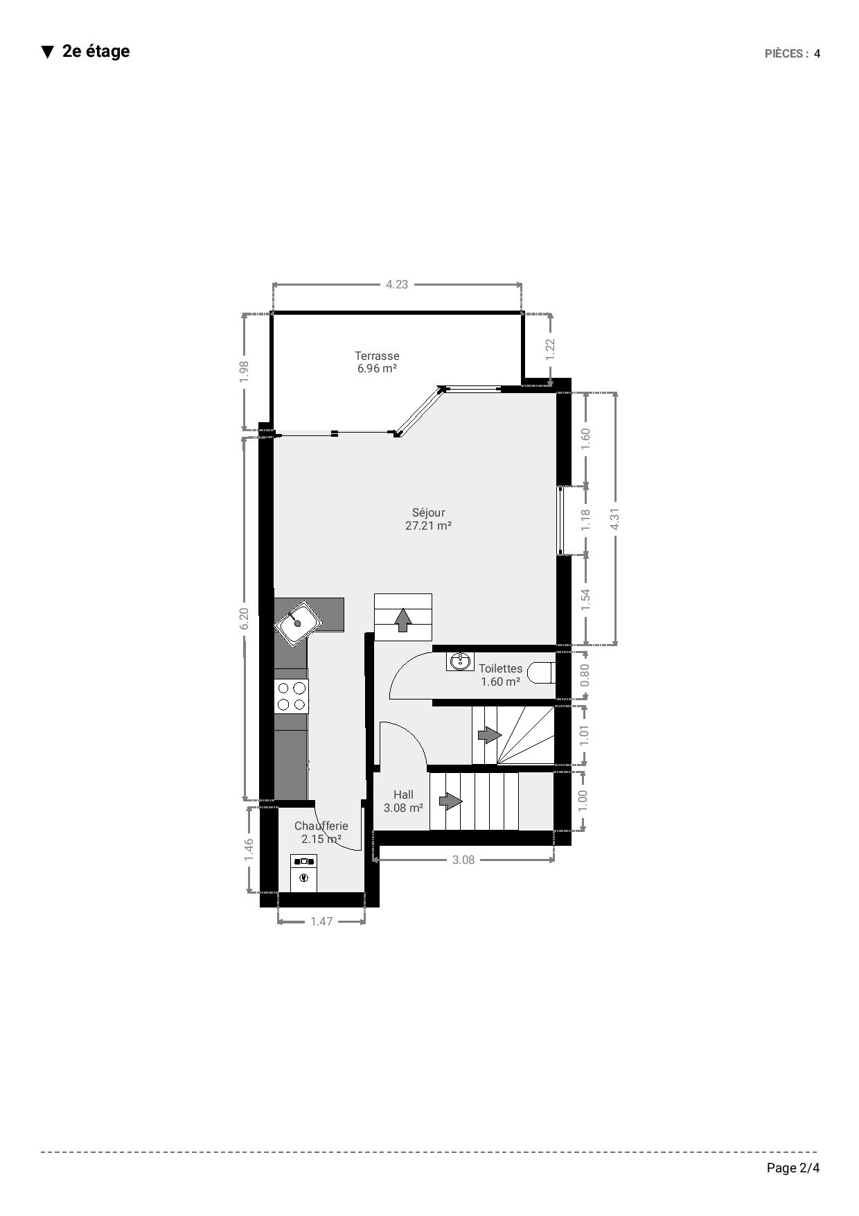 Au 2e étage, vous découvrirez un hall d’entrée avec vestiaire, un agréable séjour regroupant salon et salle à manger avec cuisine ouverte entièrement équipée, un WC séparé, une buanderie/chaufferie ainsi qu’une première terrasse.