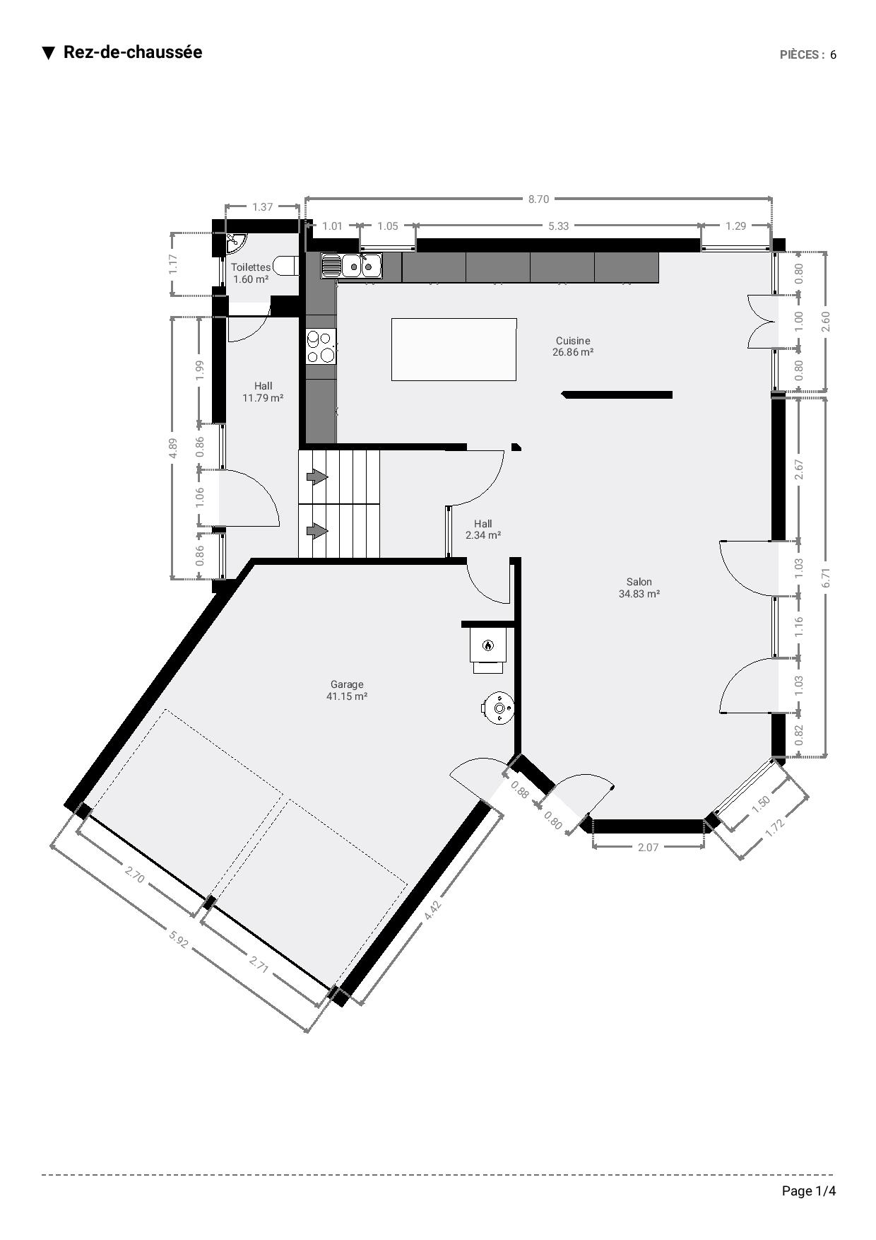 - Rez-de-chaussée : hall d’entrée avec WC séparé, vaste séjour lumineux ☀️ ouvert sur cuisine équipée, double garage et chaufferie