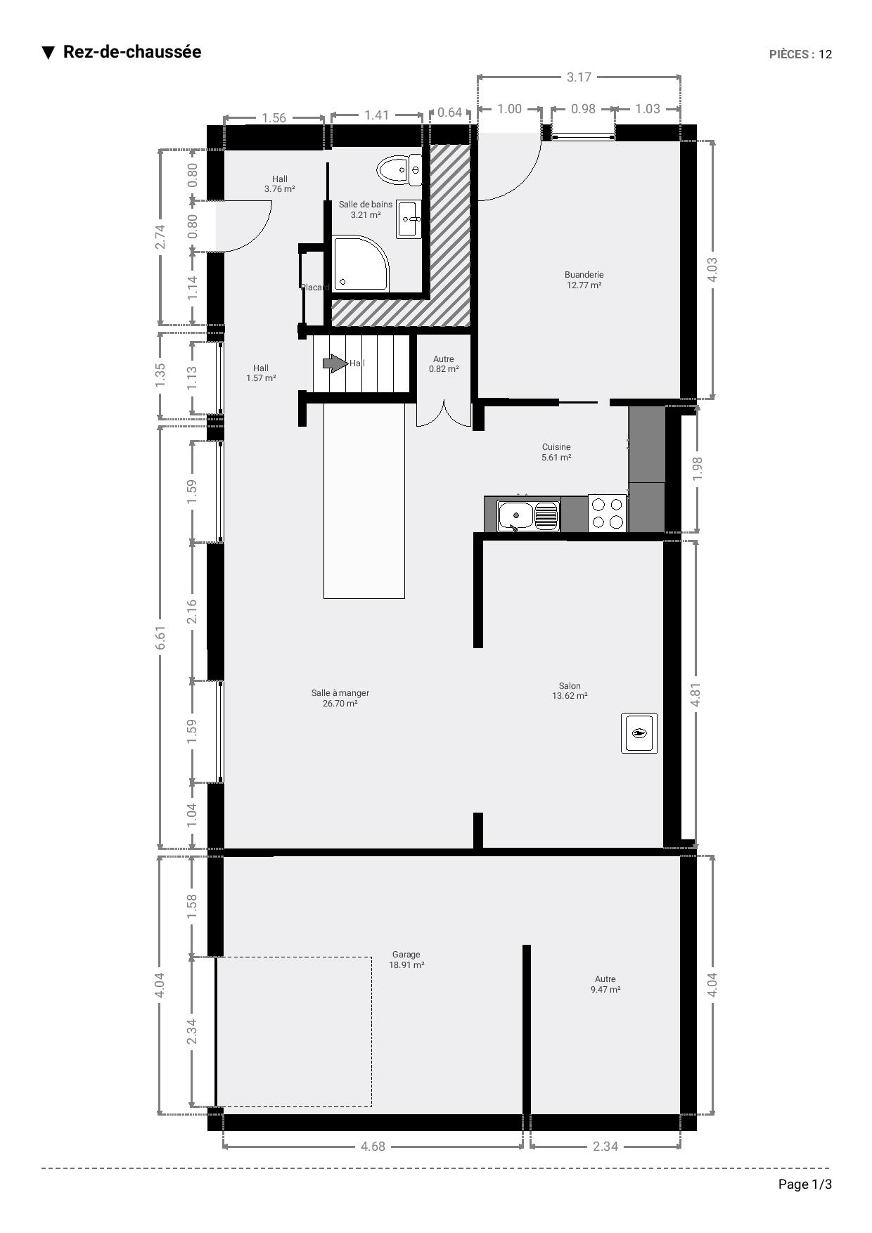 - Rez-de-chaussée : hall d’entrée, salon, salle à manger, cuisine équipée, salle de douche, garage, buanderie et débarras