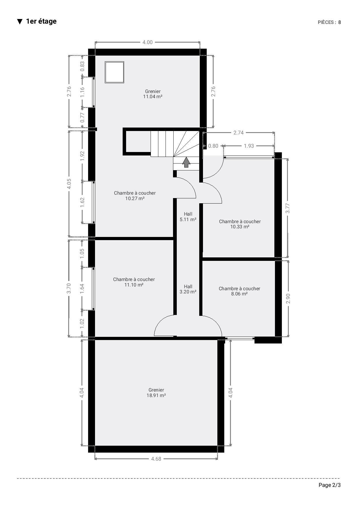 - 1er étage : hall de nuit, quatre chambres et greniers