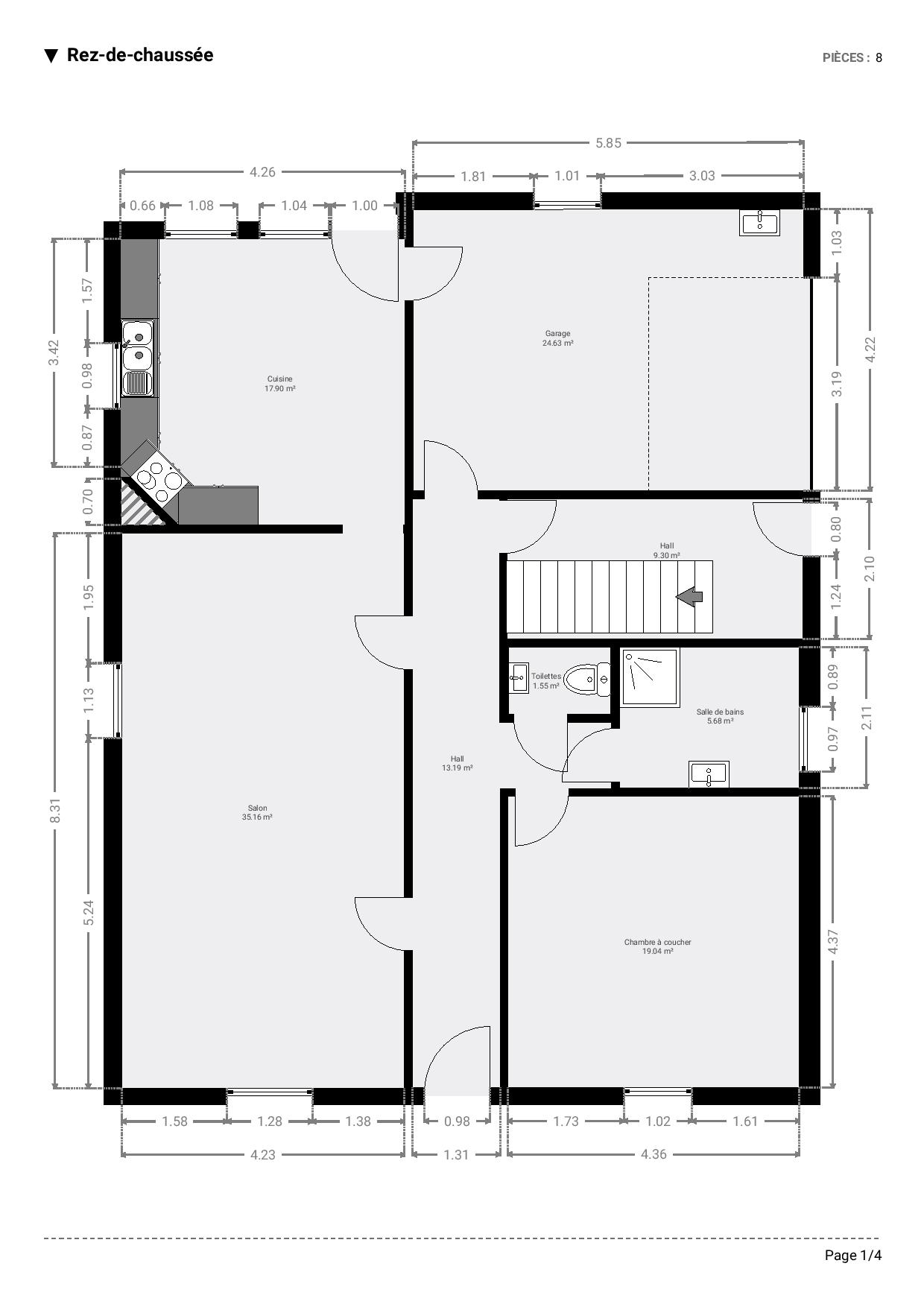 👉 Rez-de-chaussée : hall d’entrée, une chambre, WC séparé, salle de bains, garage, séjour et cuisine.